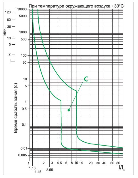 - Кривая отключения отражает порог срабатывания автомата при защите от перегрузки и короткого замыкания.