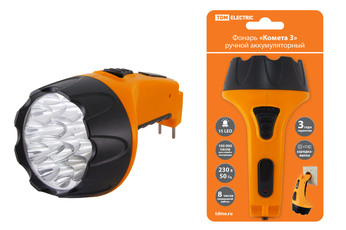 - Фонарь «Комета 3» ручной аккумуляторный, 15 светодиодов, 1,1Ач 230В вилка, TDM SQ0350-0041