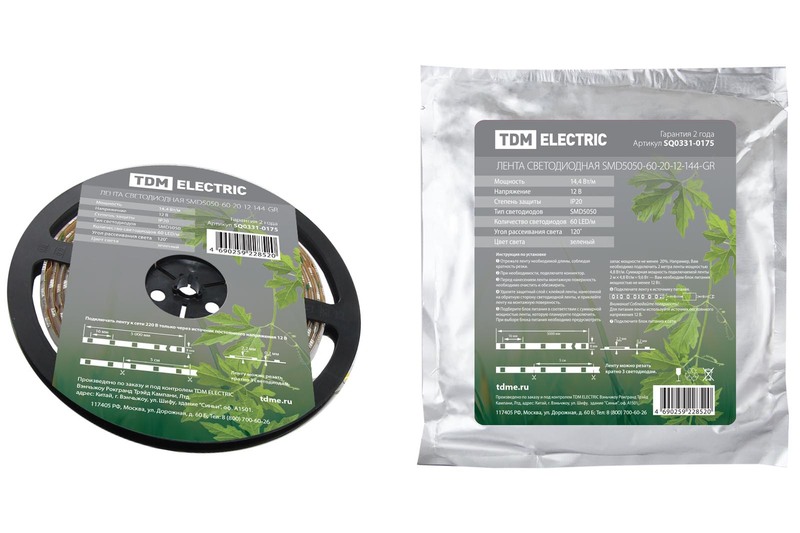 - Лента светодиодная SMD5050-60-20-12-144-GR 60LED/м, IP20, 12В, 14,4Вт, зеленый, (У) TDM SQ0331-0175